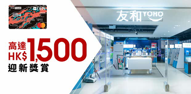 新客戶經指定連結成功申請DBS Live Fresh Card可享迎新優惠高達HK$1,000「一扣即享」金額及額外迎新獎賞於友和YOHO簽賬享高達HK$500現金回贈。