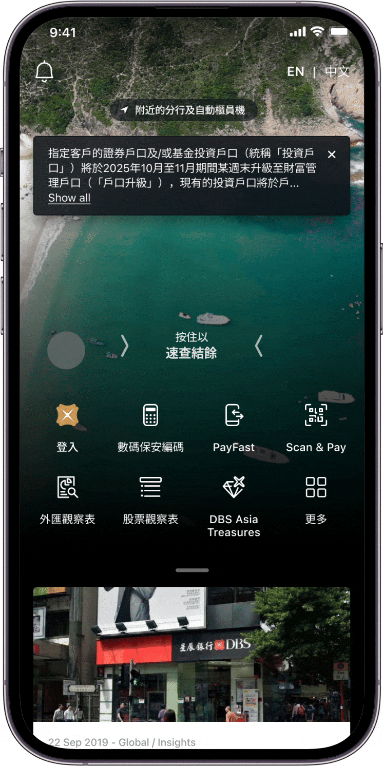 - 如您的裝置已設定數碼保安編碼,您可無縫登入DBS digibank HK