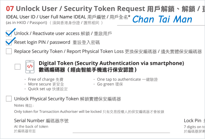 現有用戶可於第7部分提交實體保安編碼機更換申請。