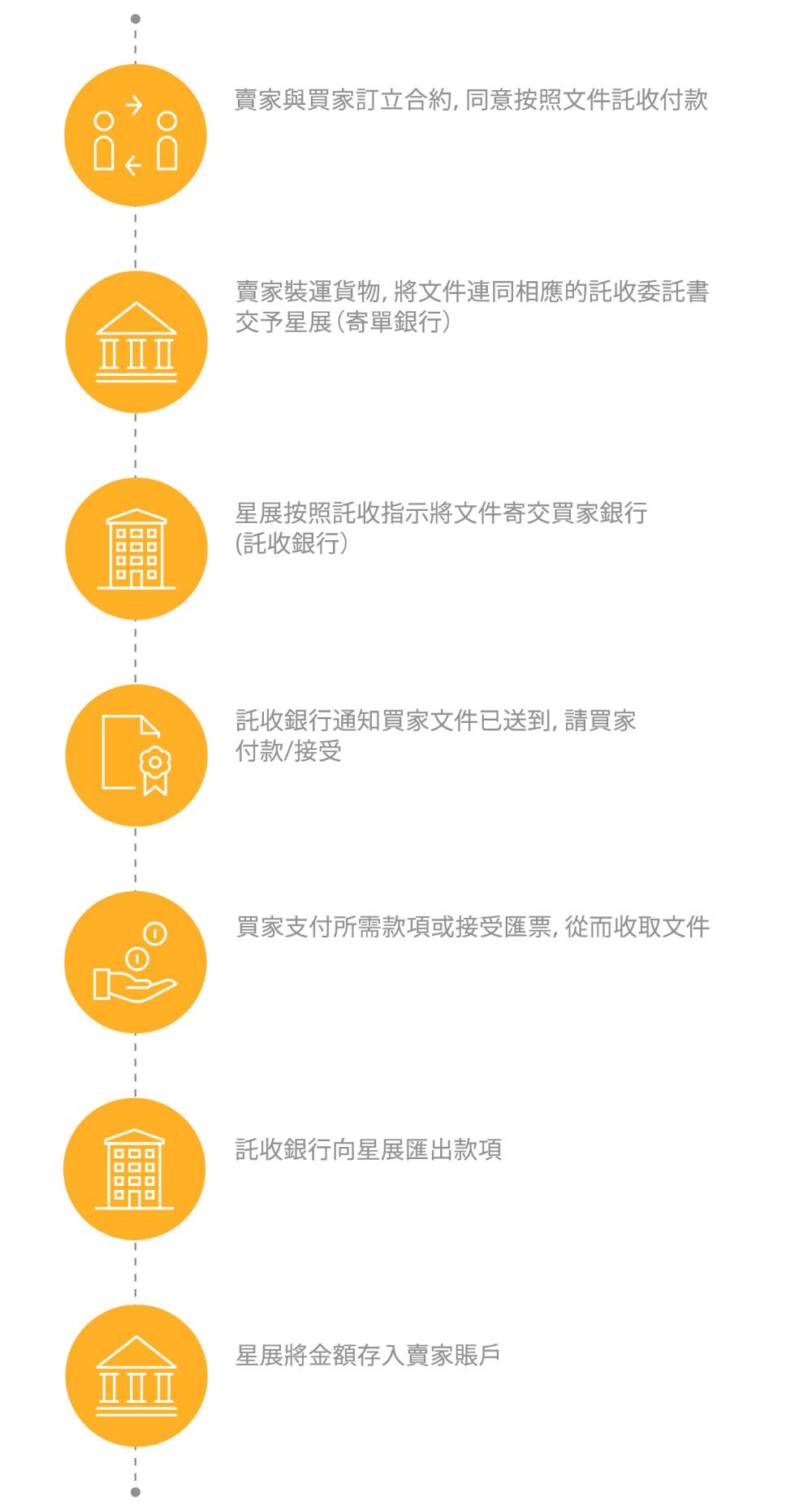 我們會將出口文件發放到買家的銀行。當買家接受託收交易,並承諾於固定到期日付款,買家的銀行將會交出文件。當買家(其銀行)完成匯款,我們便會將款項存入您的賬戶