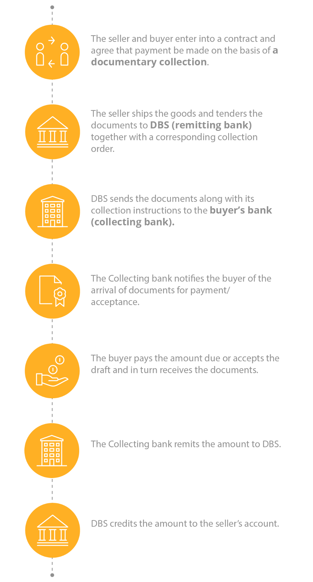 We will send your export documents to the buyers's bank. Once the buyer has accepted the bills of exchange/drafts and promised to pay on a later date, buyer’s bank will release the documents. We will credit the money to your account when the buyer (buyer’s bank) remits the payment to us