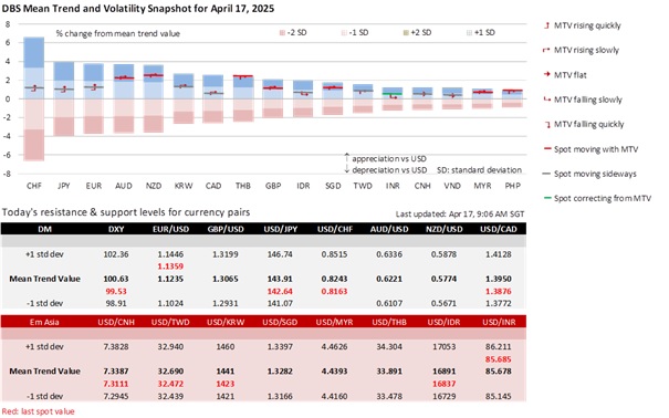 Despite the DXY Index’s 1% fall to a three-year low of 99.26 overnight, we are cautious and mindful that the DXY has yet to break below the intra-day low of 99 seen on April 11. Unlike last week, no de-dollarisation fears were inferred from investors dumping US Treasuries while exiting US equities. Yesterday, investors sought safety in bonds, driving the US Treasury 10Y yield lower a third day by 5.6 bps to 4.277% amid the 2.2% decline in the S&P 500. Markets may reverse again before US stock markets close on Good Friday; the US bond market will close early today in observance of Maundy Thursday.