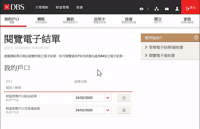 在電子結單頁面中,選擇結單類別及日期,然後點擊“去”