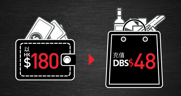 推廣期內,DBS Black Card客戶可用HK$180直接購買DBS$48^以兌換心儀禮品。無限次任你「充值」,更快兑換心頭所好!