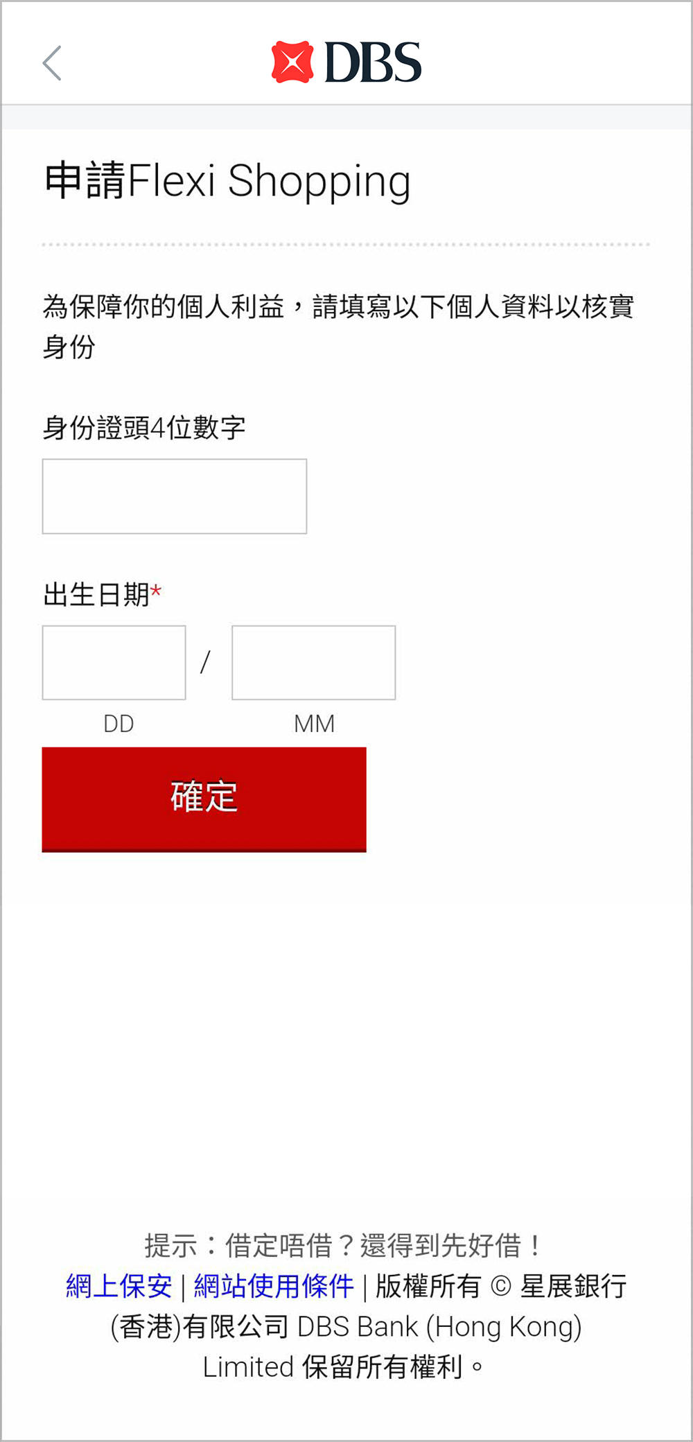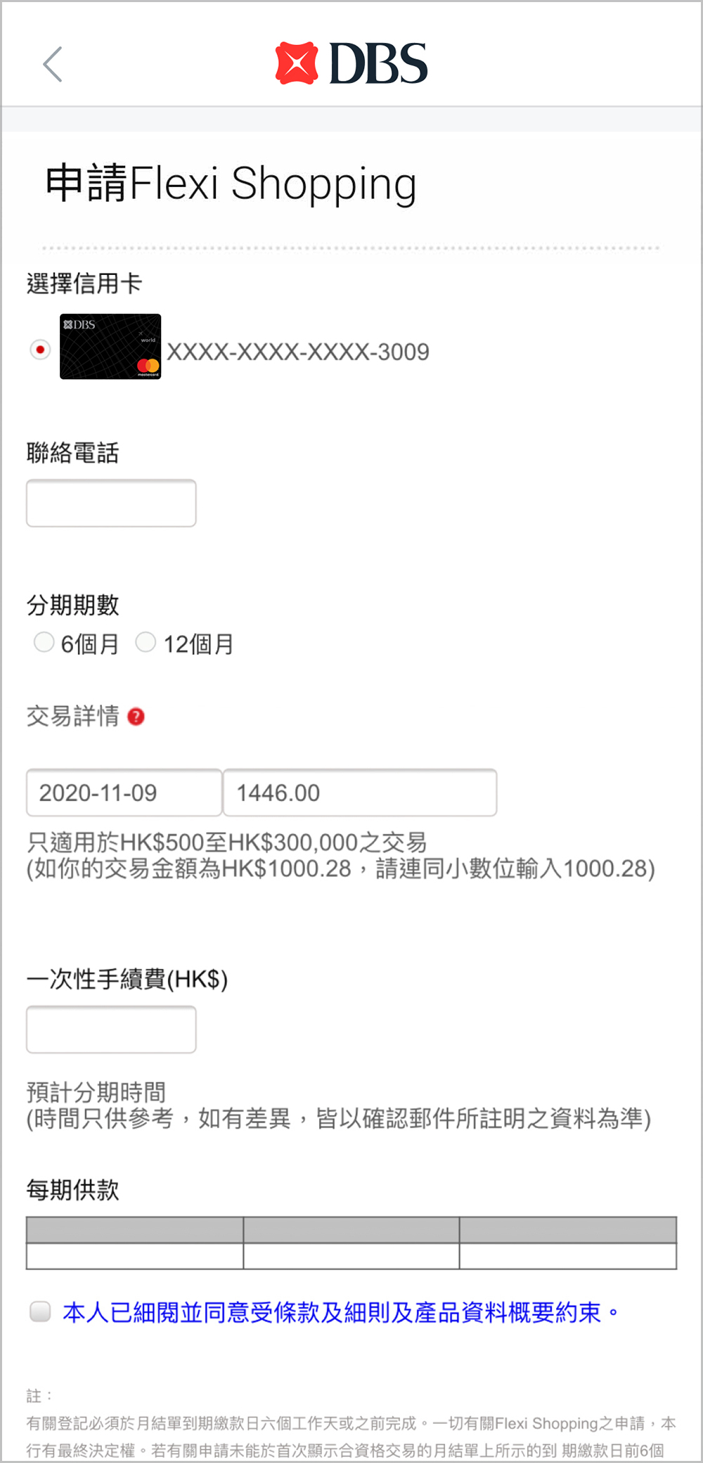 | 備註 | ### 如交易為DBS Black American Express® Card的簽賬或DBS Live Fresh 信用卡「iFlexi - 網上簽賬長達90日免息還款期」/「Flexi Travel旅遊及海外簽賬長達90日免息還款期」推廣中的簽賬,申請只限於單一簽賬交易,不可合併簽賬交易。 ***只供信用卡持卡人申請6或12個月分期的Flexi Shopping,此途徑只限單一簽賬交易的申請,不可合併簽賬交易。 |