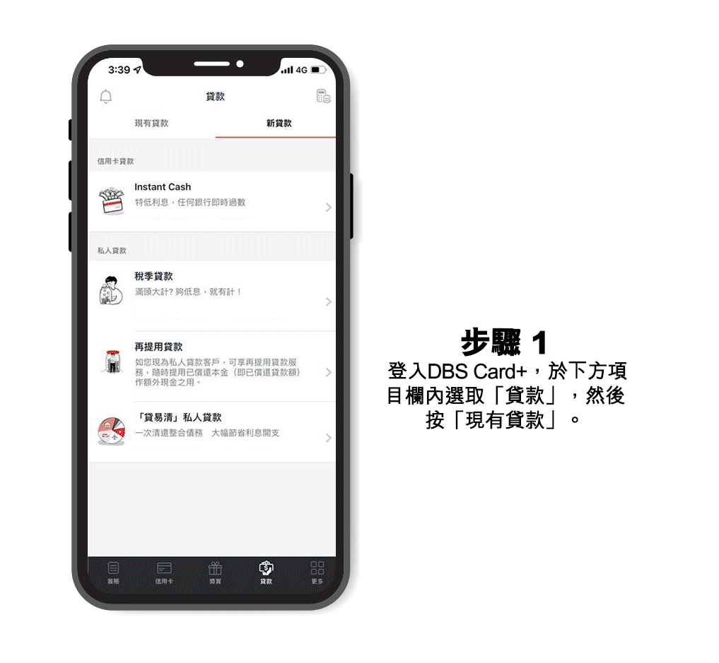 *要使用此功能,你須安裝 DBS Card+手機應用程式 (「DBS Card+」)、登記並啟動 DBS Card+賬戶。你可查閱現有貸款戶口及90天內結束的貸款戶口資料。