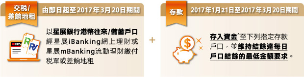 2017年1月1日至2017年3月20日期間,於指定存款戶口內維持每日戶口結餘的最低金額要求,可獲額外HK$300現金獎賞!
