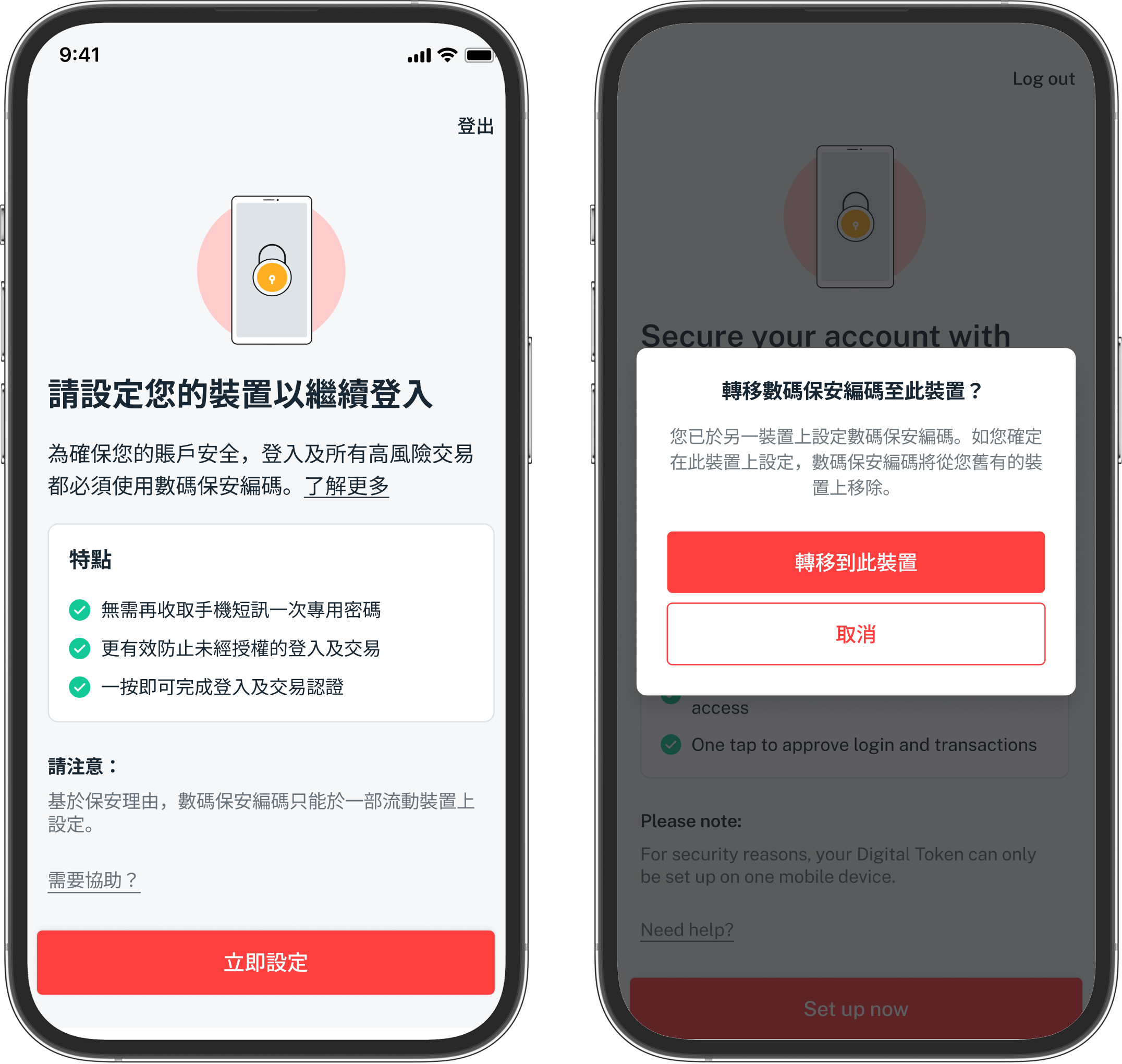 數碼保安編碼加强保障您的賬戶安全,讓您使用流動裝置認證各類網上及流動理財交易。