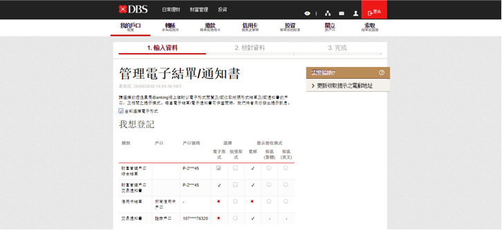信用卡客戶、Cashline貸款戶口客戶及財富管理戶口客戶於收取紙張結單的同時,亦會於星展iBanking網上理財收取電子結單。