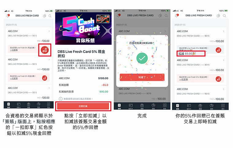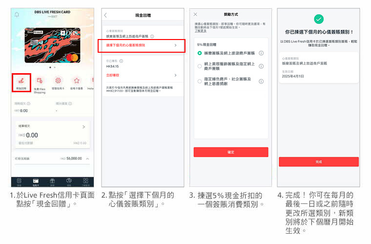DBS Live Fresh信用卡持卡人只需在DBS Card+ app 登記並揀選心儀交易類別一次,隨後每月選取的交易類別即可享額外5%現金回贈。你亦可隨時重選心儀交易類別,並於下個月的第一天生效。