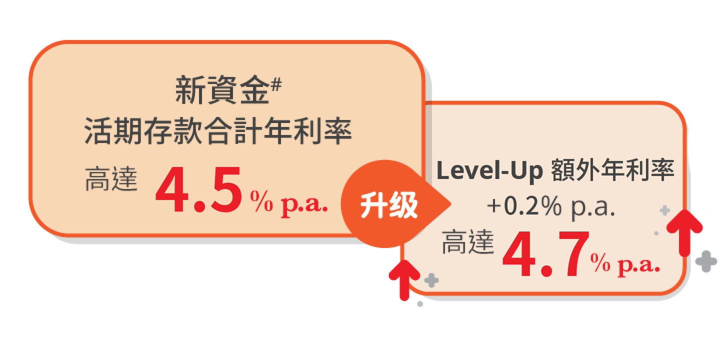 @Level-Up 額外年利率只適用於首HK$500,000 及 / 或 US$65,000合資格新資金。
