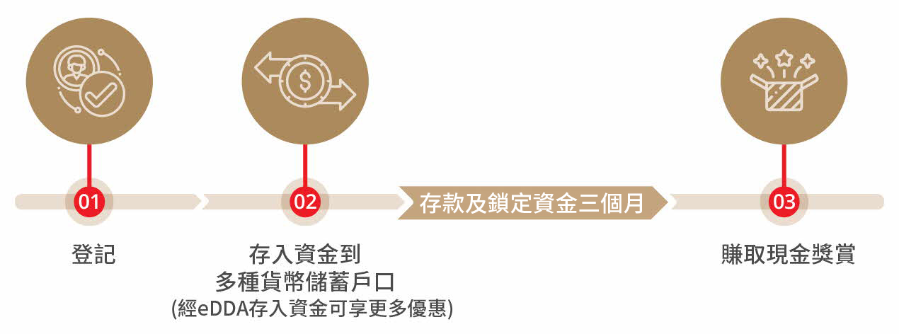 @相關新資金限時優惠額外$1,000現金獎賞,適用於2025年12月31日或之前存入港元$1,000,000及/和美元$125,000合資格新資金至多種貨幣儲蓄戶口,並維持該資金至2026年2月28日完結的合資格客戶。優惠須受有關條款及細則所約束。