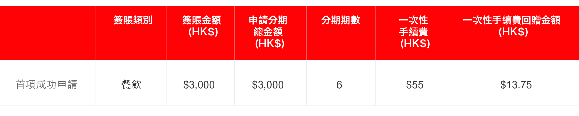 例子1: 推廣期內,於餐飲商戶單一簽賬HK$3,000並透過DBS Card+成功申請收取一次性手續費的 Flexi Shopping 6 個月分期,可享相等於該合資格簽賬於 Flexi Shopping 應收取的一次性手續費金額 25%的現金回贈,即HK$13.75回贈。
