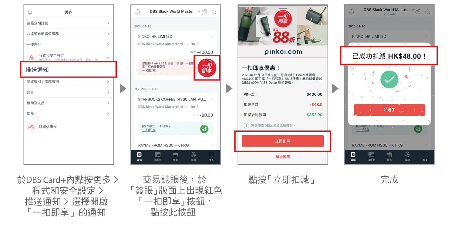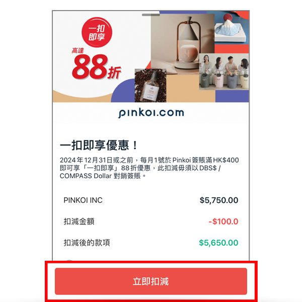 推廣期內每月1日於Pinkoi網站 / 手機應用程式以DBS信用卡經「信用卡安全加密付款」單一簽賬淨金額滿HK$400或以上,可享