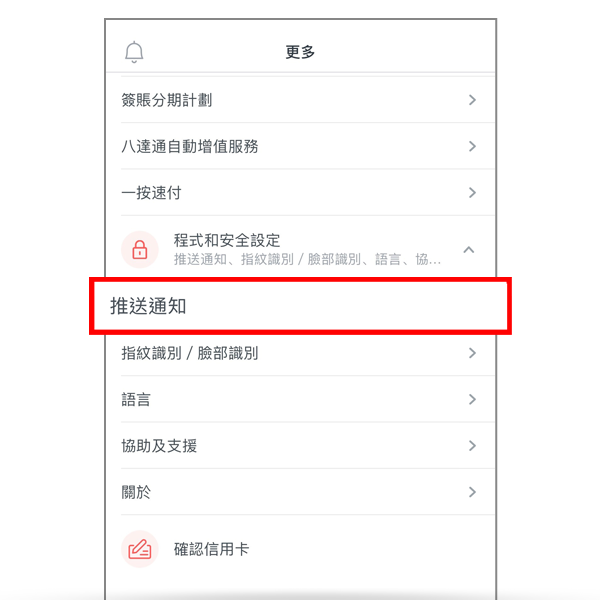 步驟1:於DBS Card+內點按「更多」 > 程式和安全設定 > 推送通知 > 選擇開啟「一扣即享」的通知