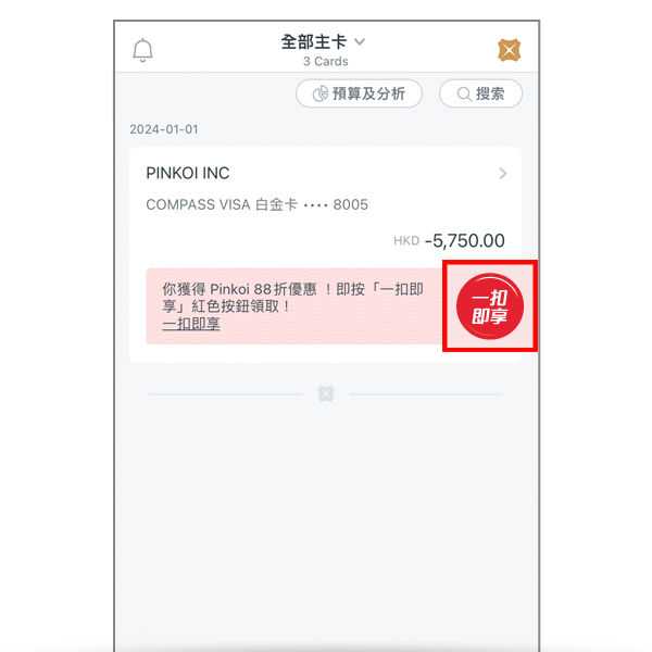 步驟2:交易誌賬後,「簽賬」版面上將出現紅色「一扣即享」按鈕,請點按此按鈕