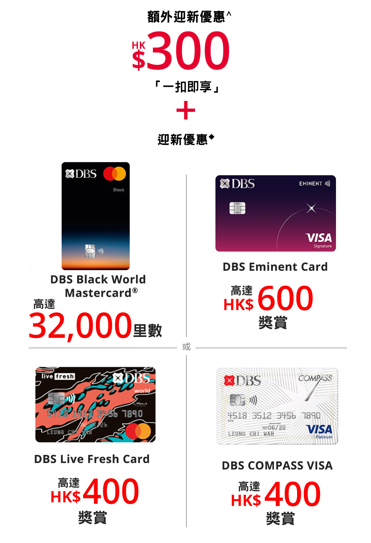 新客戶▲經以下指定連結成功申請指定DBS信用卡,可額外獲享獨家迎新優惠 —— HK$300 「一扣即享」獎賞^!立即行動!