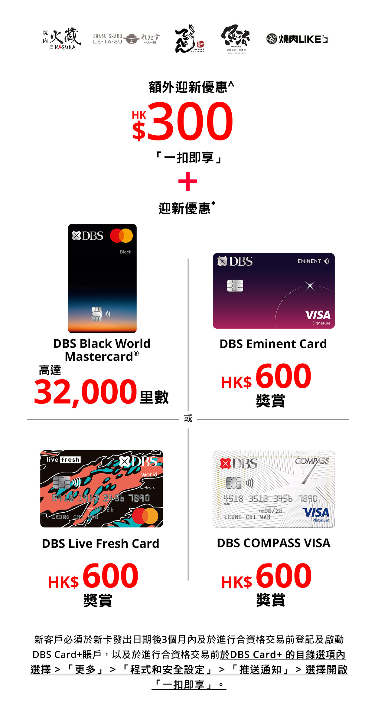 新客戶▲經以下指定連結成功申請指定DBS信用卡,可額外獲享獨家迎新優惠 —— HK$300 「一扣即享」^即時扣減簽賬!把握機會,立即申請以享精彩優惠!