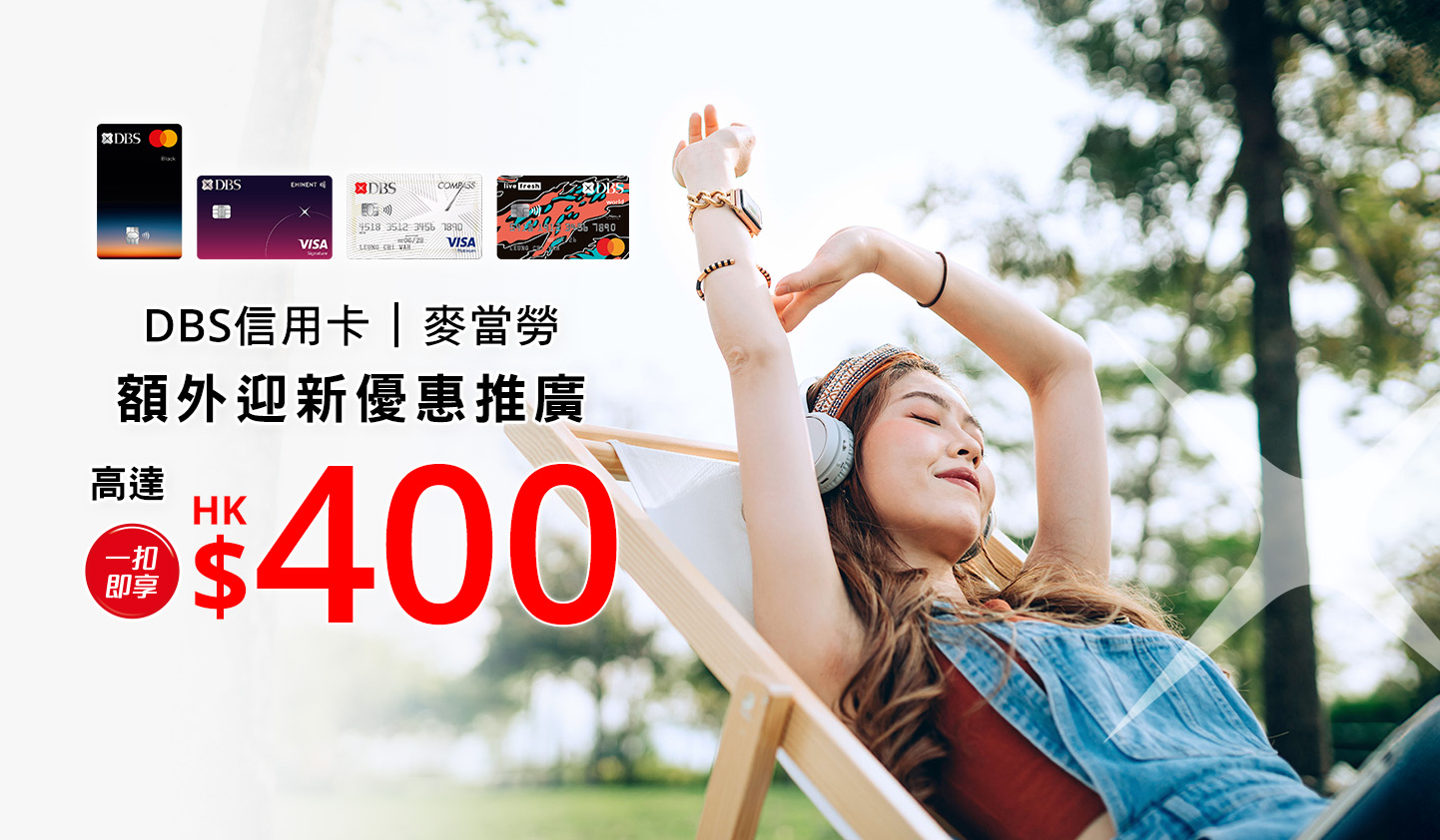 ^ 有關DBS 信用卡x 麥當勞額外迎新優惠高達HK$400「一扣即享」推廣須受有關條款及細則約束,請按此瀏覽。