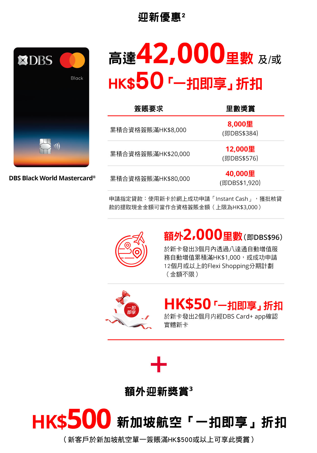 新客戶1經以下指定連結成功申請DBS Black World Mastercard®,可享迎新優惠高達42,000里數及/或HK$50「一扣即享」折扣2之餘,更額外賞你HK$500「一扣即享」折扣3!