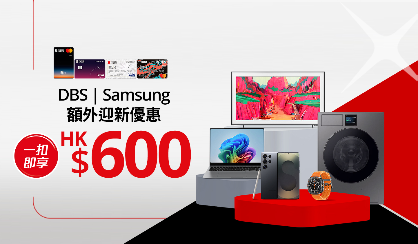^ 有關DBS 信用卡x Samsung額外迎新優惠HK$600「一扣即享」推廣須受有關條款及細則約束,請 按此瀏覽。