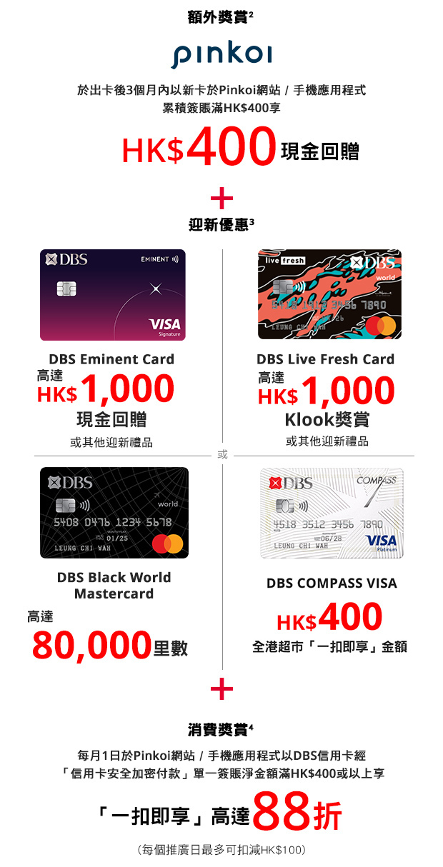 2. 有關DBS信用卡Pinkoi額外迎新優惠須受有關條款及細則約束,詳情請按此瀏覽。