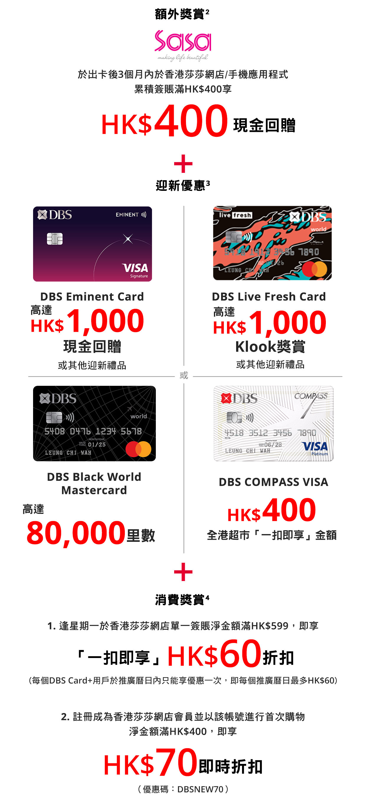 2. 有關DBS信用卡香港莎莎網店額外迎新優惠須受有關條款及細則約束,詳情請按此瀏覽。