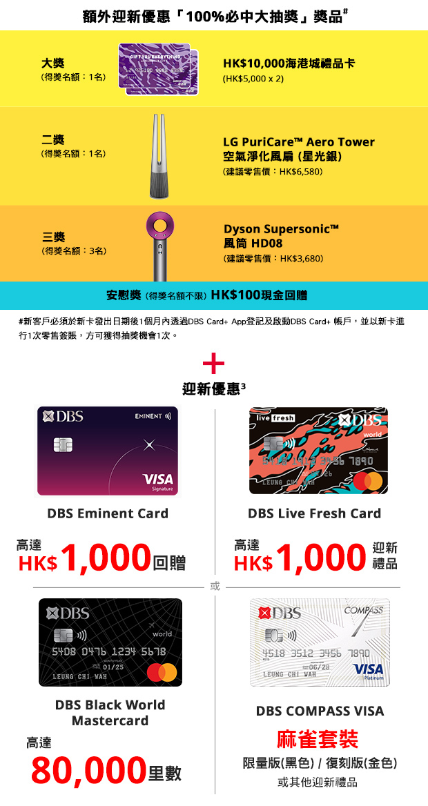 2. 有關DBS 信用卡額外迎新優惠 – 「100%必中大抽獎」的推廣詳情與條款及細則,請按此瀏覽。