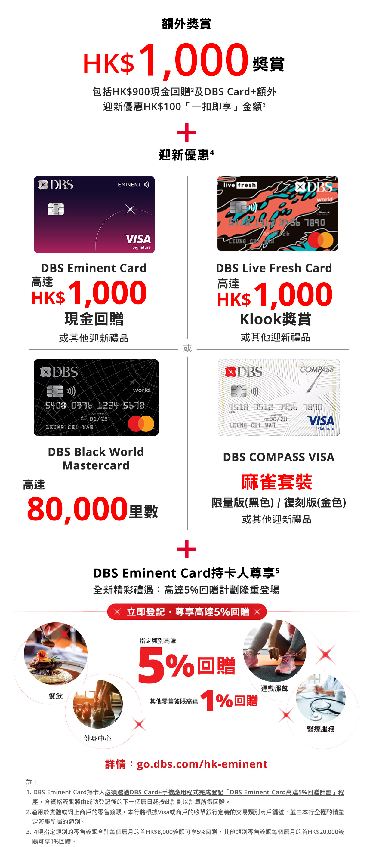 5. DBS Eminent Card高達5%回贈計劃須受條款及細則約束,詳情請瀏覽go.dbs.com/hk-eminent。