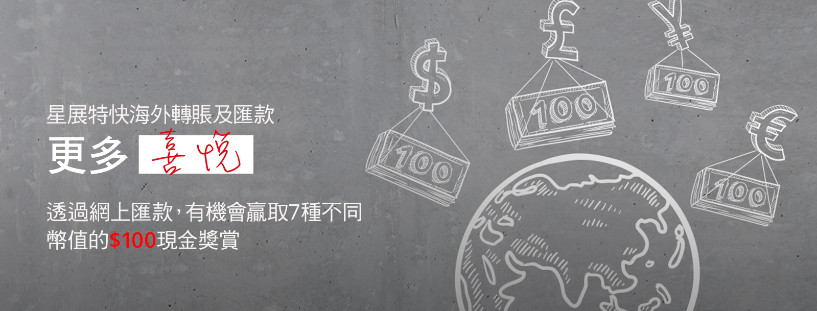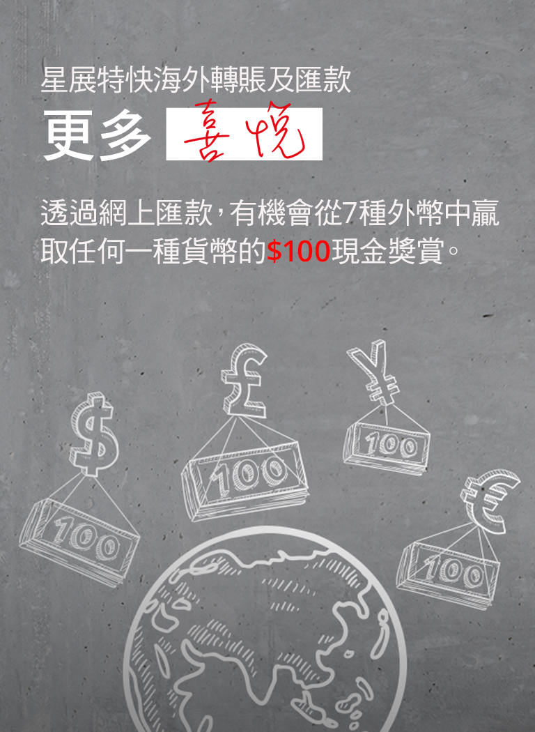 從港元、美元、英鎊、歐羅、加元、澳元或新加坡元中贏取任何一種貨幣的$100現金獎賞
