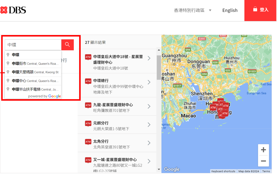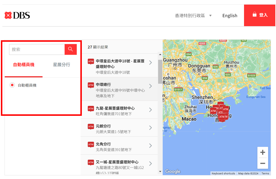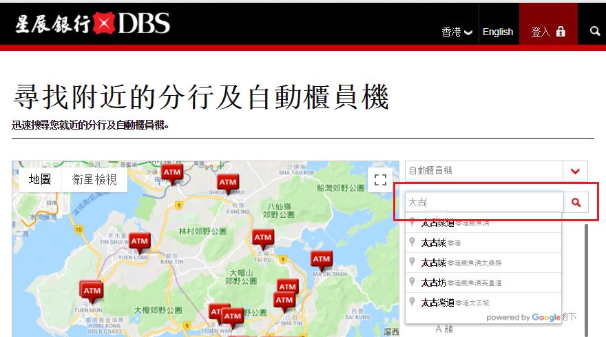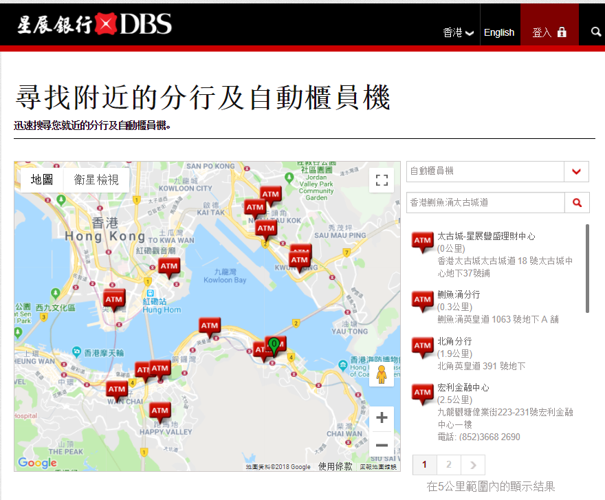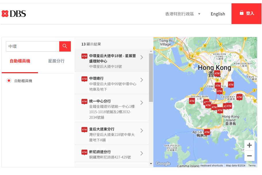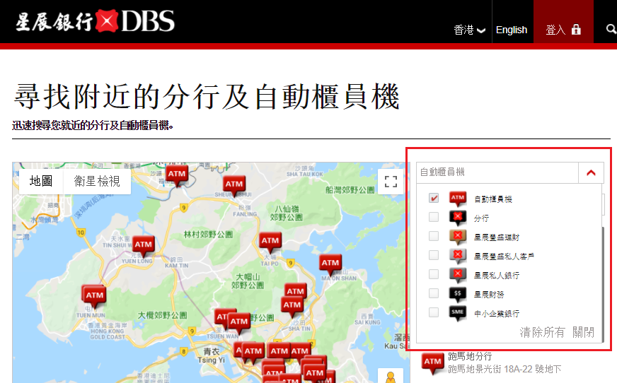 您可點擊 ATM 標誌以查閱自動櫃員機服務範圍、位置、服務時間及街景服務