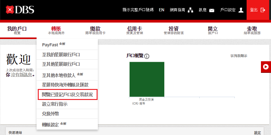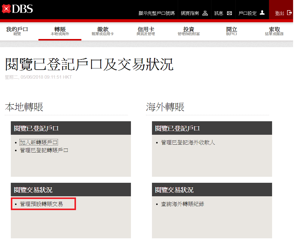 - 登入星展 iBanking網上理財,於「轉賬」揀選「閱覽已登記戶口及交易狀況」