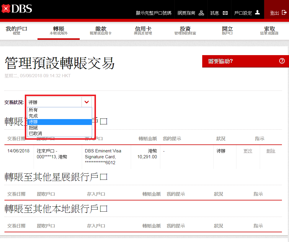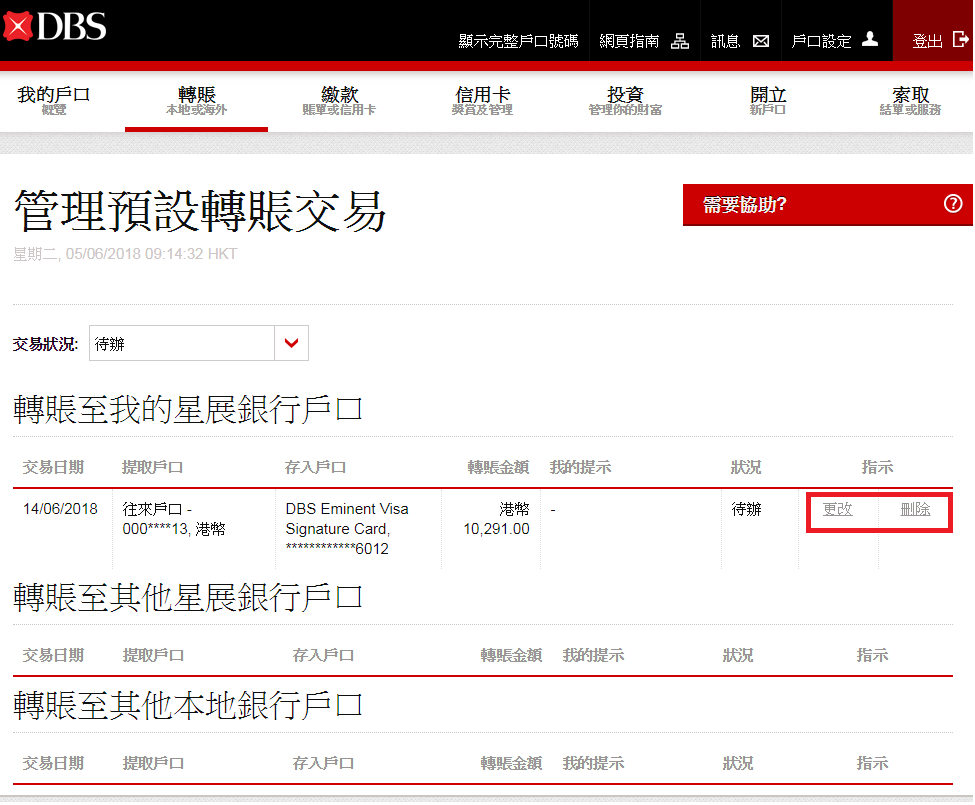 如何透過星展 iBanking 網上理財管理已預設的本地轉賬交易?