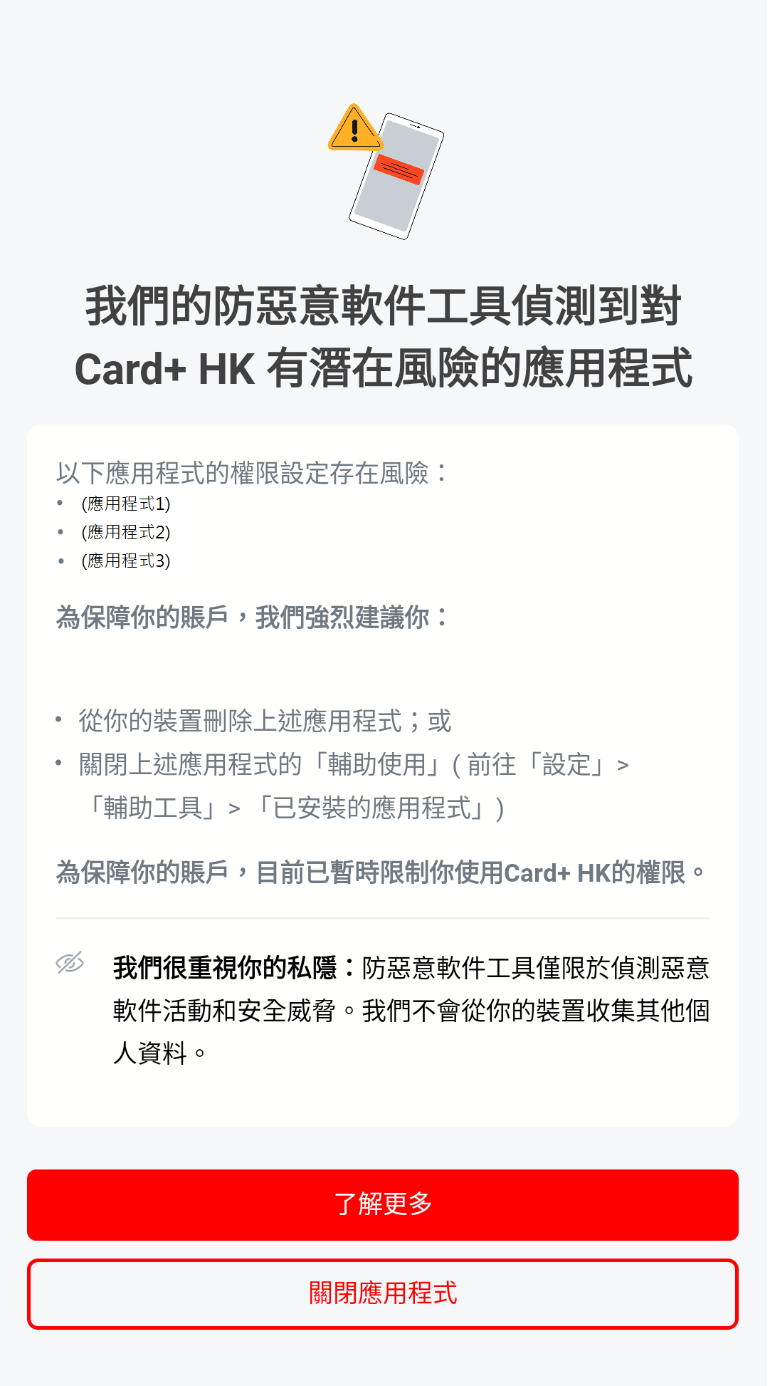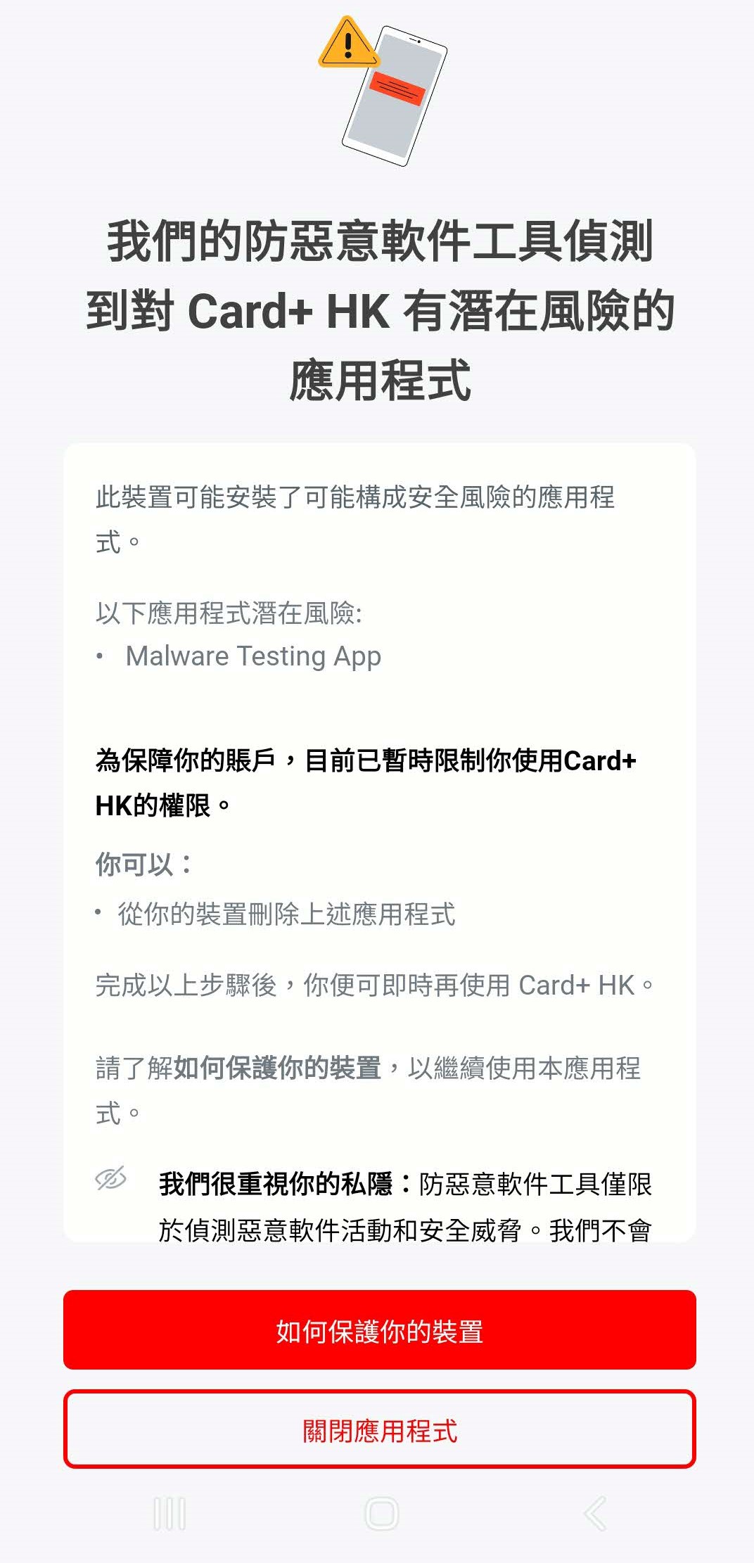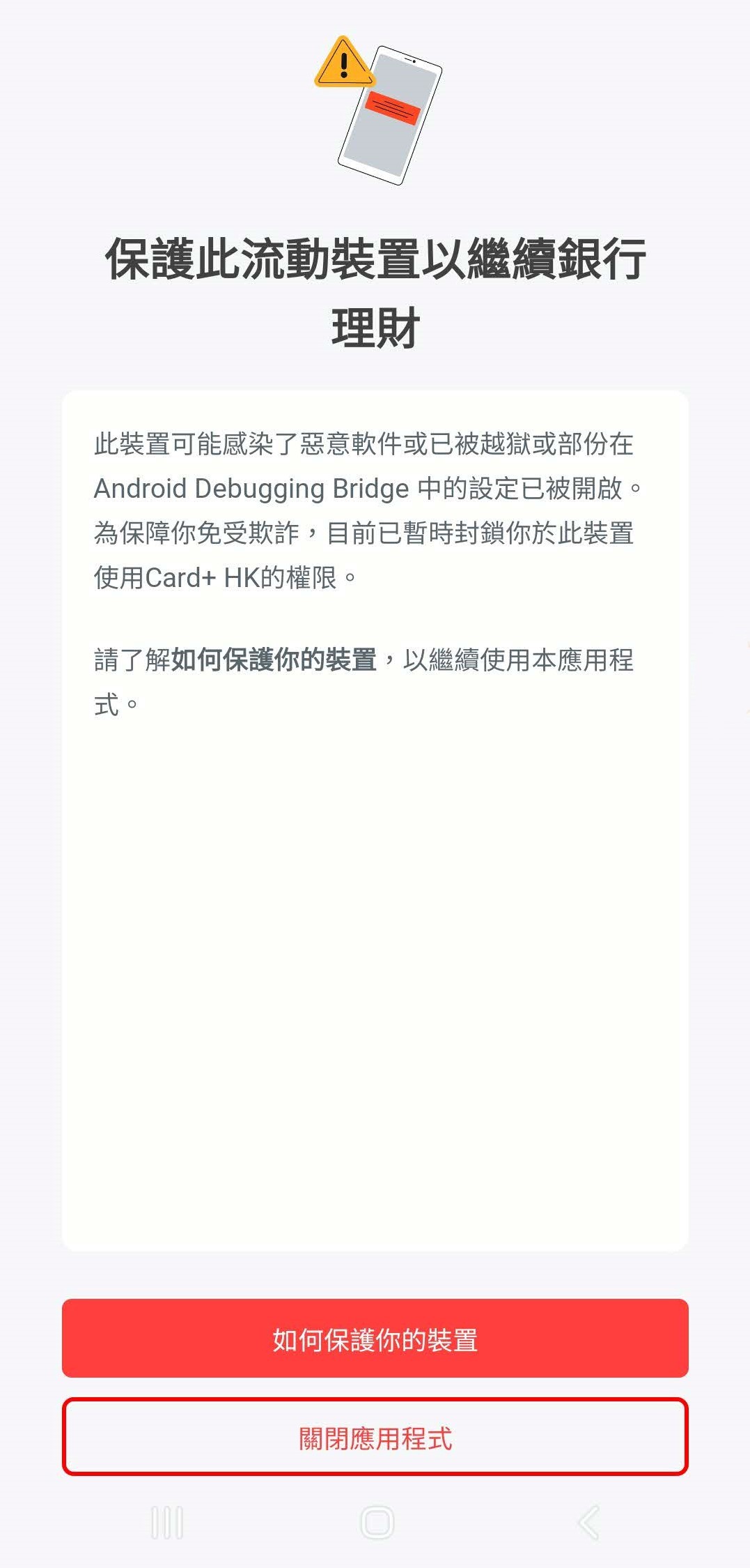 如你收到此訊息,代表你的裝置已越獄或被盜取 root 權限,或Android Debugging Bridge 中的設定已被開啟,為保障你免受欺詐,目前已暫時封鎖你於此裝置使用Card+ HK的權限。請了解如何保護你的裝置,以繼續使用本應用程式。 |