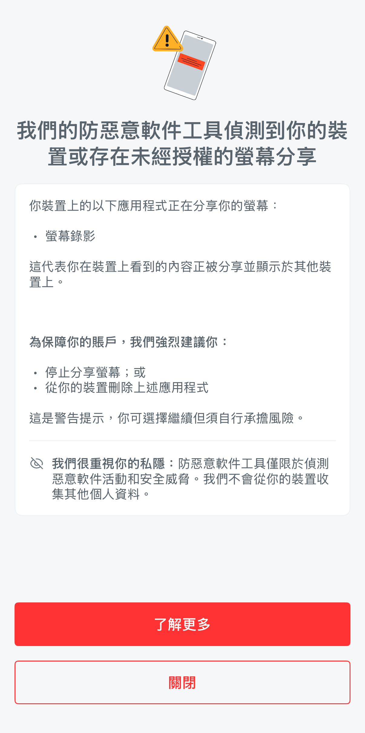 如你收到此訊息,代表你的流動裝置存在並非從官方商店下載的應用程式,並已開啟輔助使用設定,或有機會讓騙徒控制你的裝置。 |