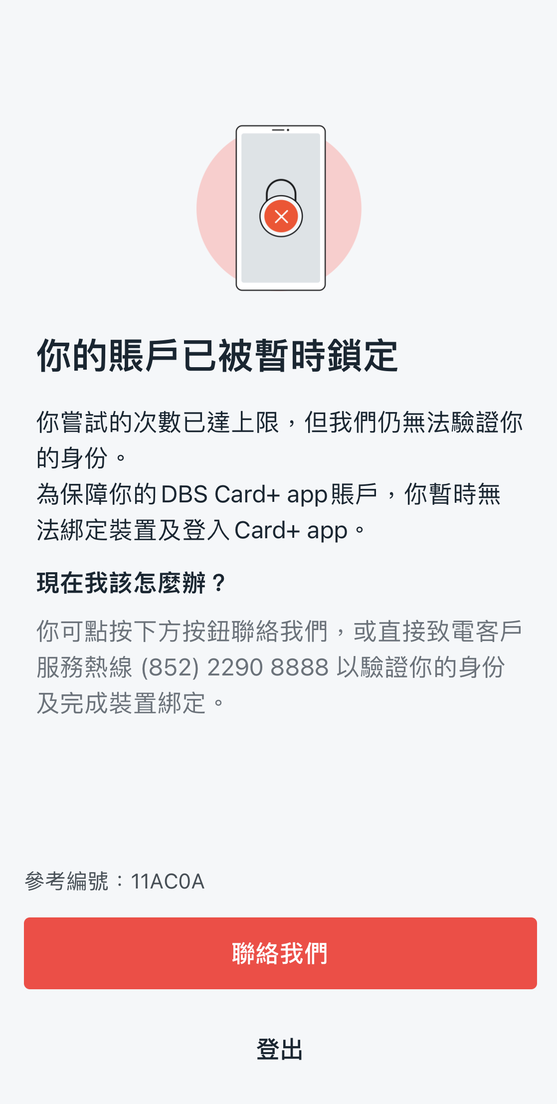 當裝置綁定次數已達到上限,導致你無法重試並登入DBS Card+ app,請立即與我們聯繫。