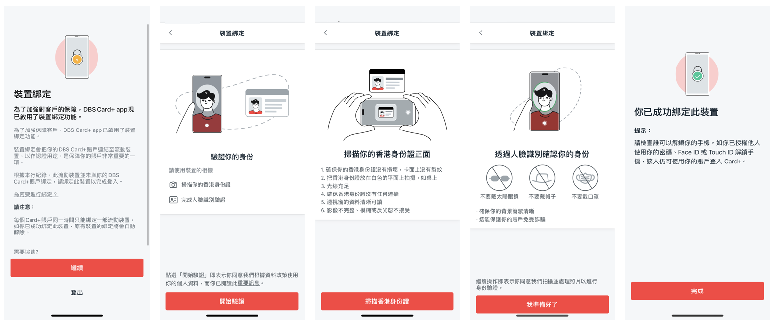 裝置綁定是指將你的DBS Card+ 賬戶綁定你的裝置,以便於交易或理財時進行身份驗證。成功綁定裝置後,你只能以同一裝置登入DBS Card+ app,及於app內查閱信用卡詳情。
