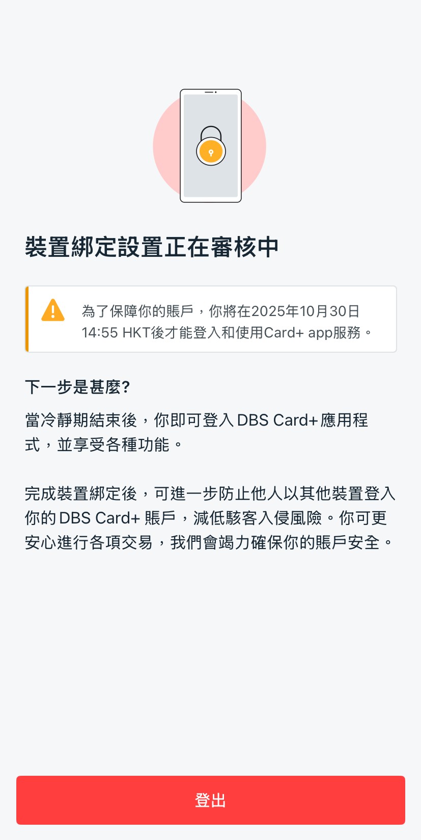當你在 DBS Card+ app 看到此頁面,表示我們正在審核你的綁定紀錄,以確保你的賬戶安全。您可以在 12 小時冷靜期結束後登入 DBS Card+ app。