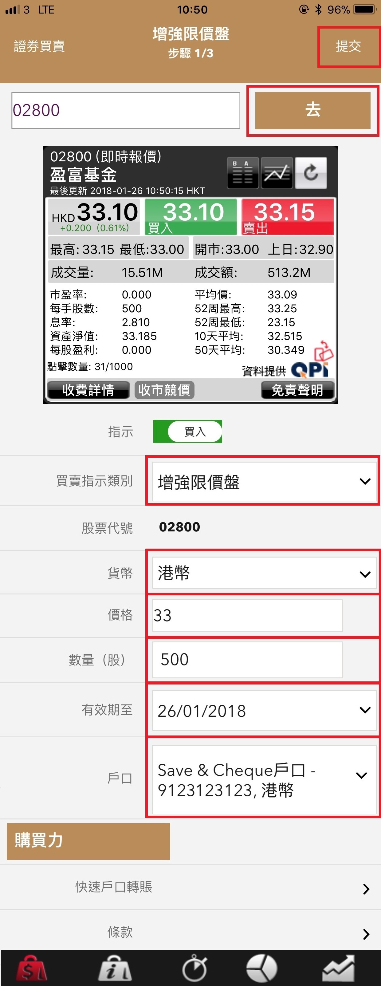 輸入「價格」、「數量」、「有效期至」及點選交易「戶口」。