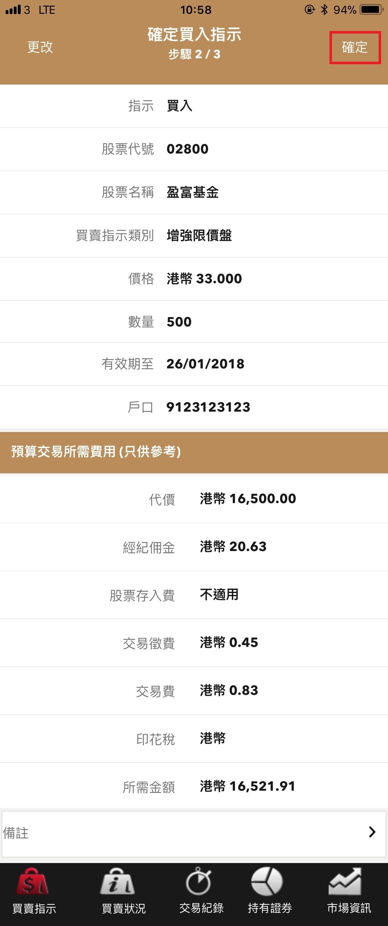 3. 要確認指示,請在「確定買入指示」頁(步驟2/3),仔細核對,如交易資料沒有問題,請按「確定」以送出指示。如需要更改或最消,可按「更改」退回上一步。