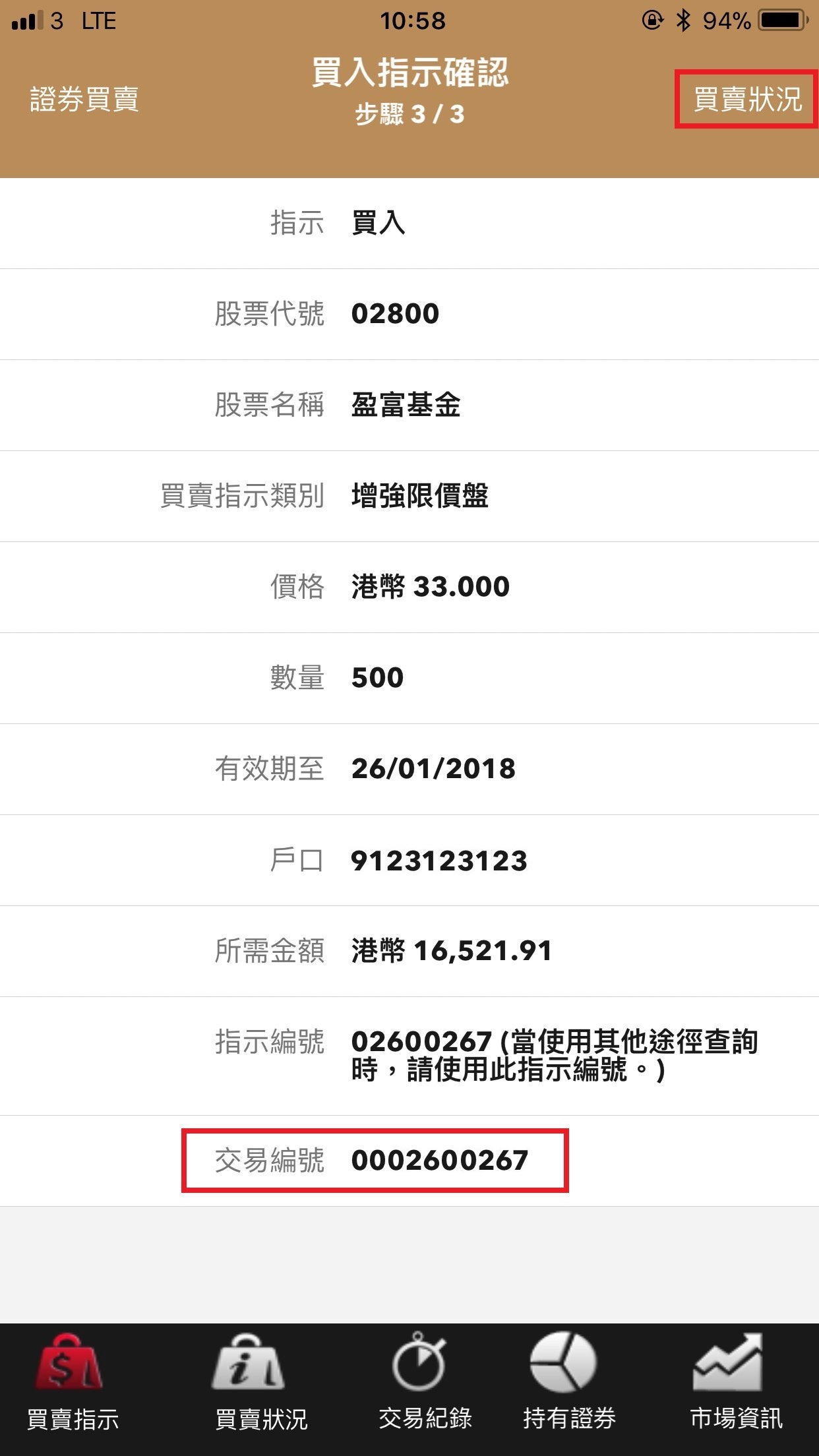 4.「買入指示確認」頁中(步驟3/3),會提供交易編號。