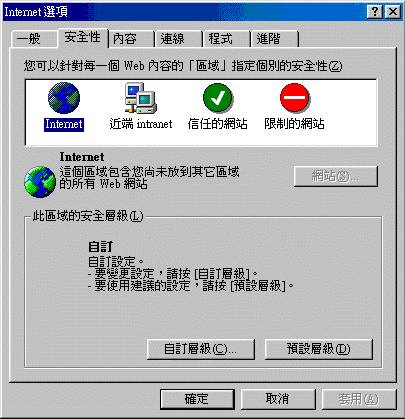 3. 於Web內容的「區域」選擇「Internet」,然後按「自訂層級」