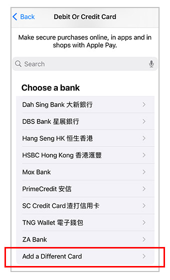 Step 1:Open your digital wallet, tap “Add” icon and select “Add a different card”, then enter credit card information by following the instructions.