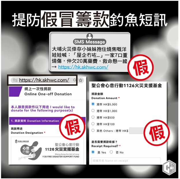 • 切勿點擊可疑籌款短訊內的連結或轉帳至不明銀行户口;