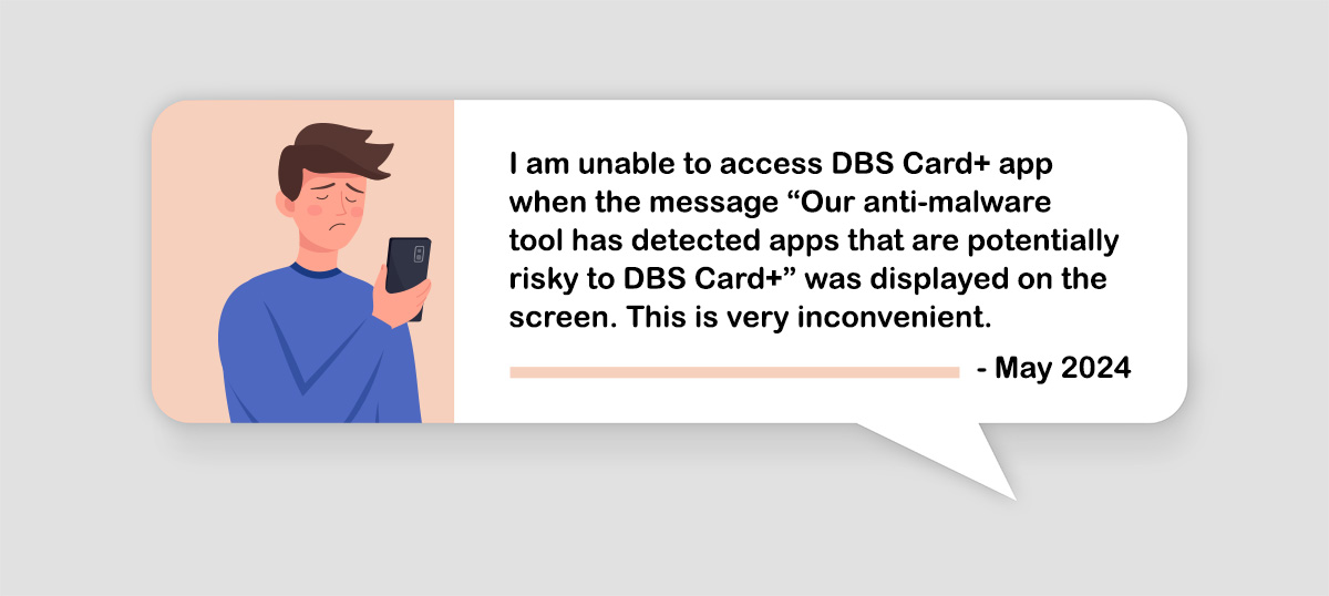 DBS Card+ app access when it detects login attempts from mobile devices that are likely infected with malware or have settings that make it prone to security vulnerabilities. This is our security measure to safeguard you against potential malware threats.