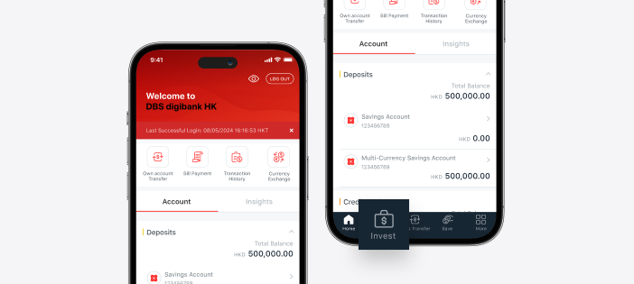 | 1. | Log in to DBS digibank HK app and tap <Invest> on the bottom menu. |