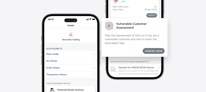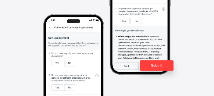 | 4. | Take this assessment to find out if you are a vulnerable customer and how to lower the associated risks. Tap <SUBMIT> to complete the questionnaire, and your assessment result will be reflected in real time. If you have doubts about your Vulnerable Customer Assessment result, you can retake the whole questionnaire or reach out to your Relationship Manager/our Bank staff to understand more about your situation. |