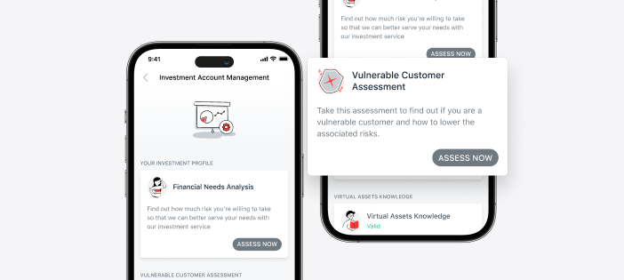 | 5. | Take this assessment to find out if you are a vulnerable customer and how to lower the associated risks. Tap <SUBMIT> to complete the questionnaire, and your assessment result will be reflected in real time. If you have doubts about your Vulnerable Customer Assessment result, you can retake the whole questionnaire or reach out to your Relationship Manager/our Bank staff to understand more about your situation. |