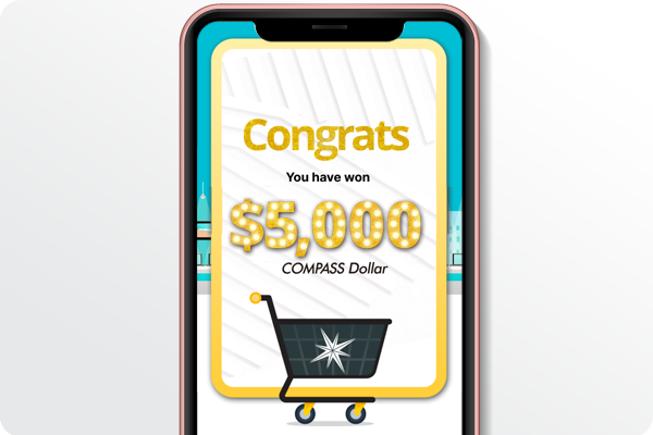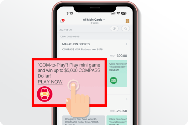 Play and win COMPASS Dollar ! During the promotion period, principal cardholders of DBS COMPASS VISA can participate in our “COM-to-Play” Mini Game via DBS Card+ app upon making a single net transaction of HK$200 or above at the following designated spending categories (physical or online stores) to randomly win: