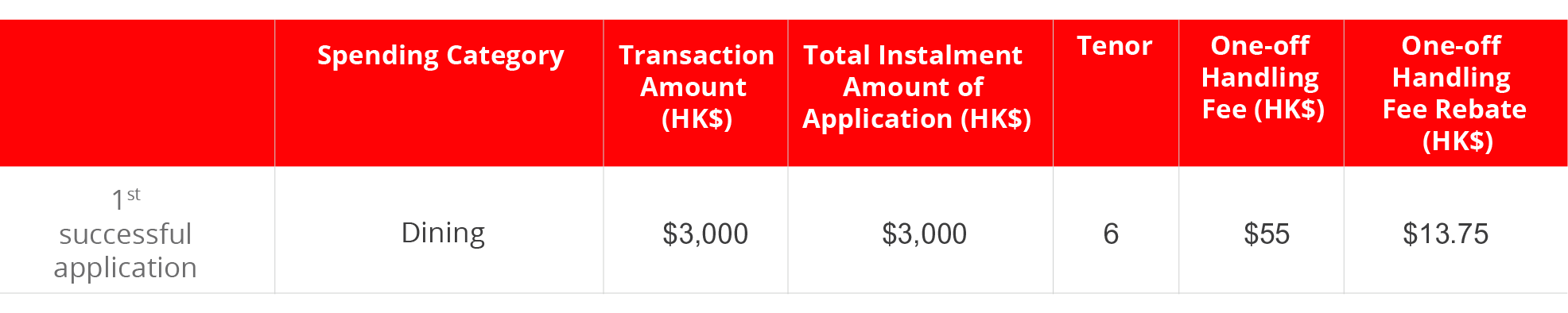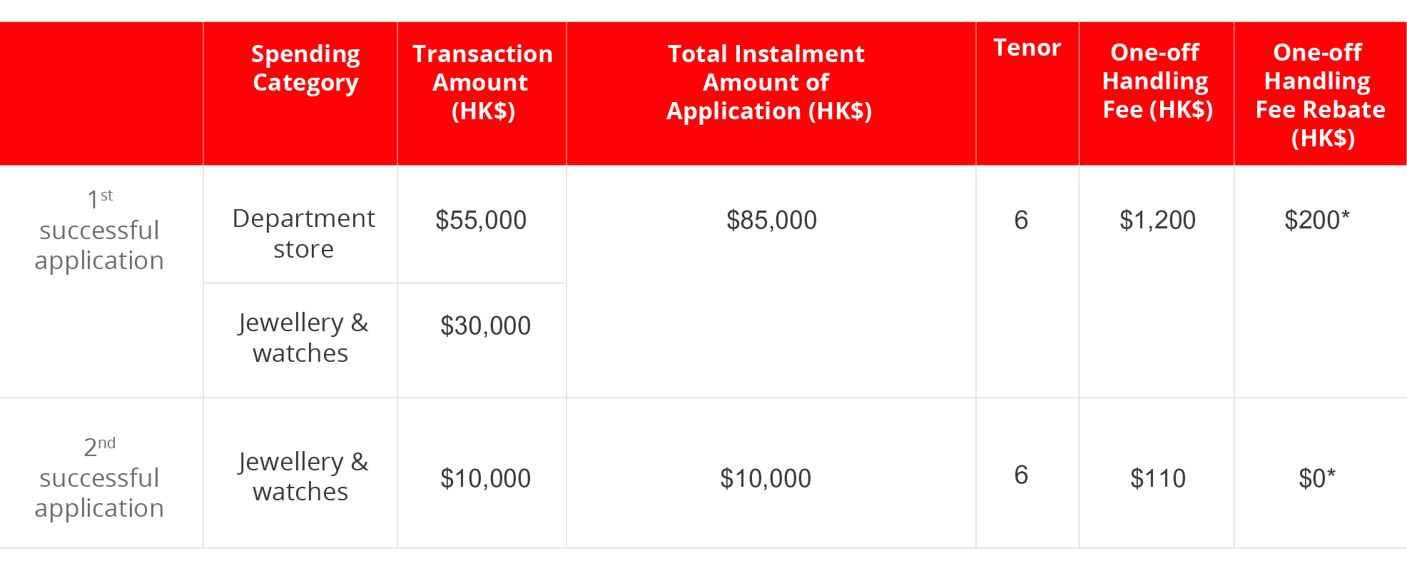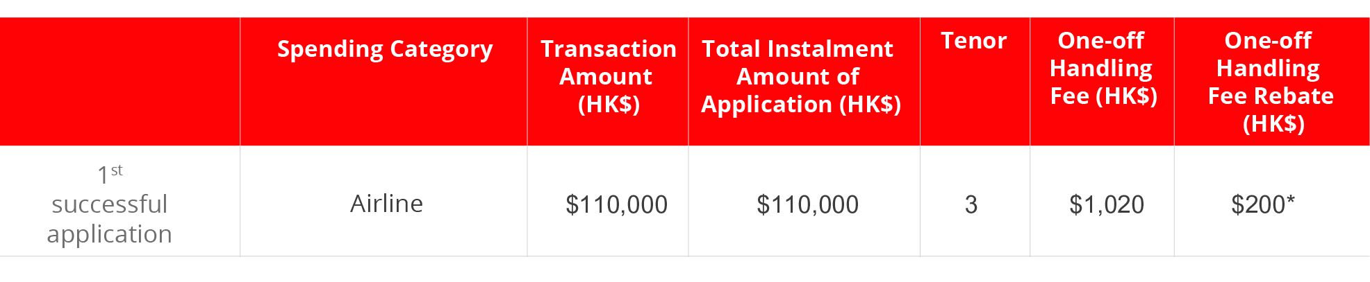 * The maximum one-off handling fee rebate is HK$200 and is only applicable to the Designated Spending Categories. Each Cardholder can enjoy the Fee Rebate once only under this Promotion.